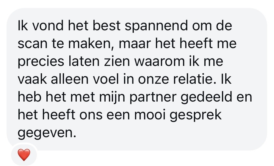 De test gaf een goede basis om diepgaande gesprekken te voeren en ons begrip voor elkaar te verdiepen. Over het algemeen heeft het ons geholpen om onze relatie te versterken en te groeien als partners. Aanrader!”