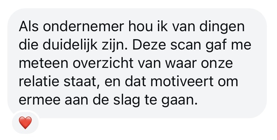 “De RelatieScan™ was erg behulpzaam. Het bood inzicht over onze relatie. Zo werden hierdoor de sterke punten in onze relatie duidelijk en welke gebieden nog verbeterd konden worden. Het bood concrete suggesties om de communicatie te verbeteren en conflicten effectiever aan te pakken.